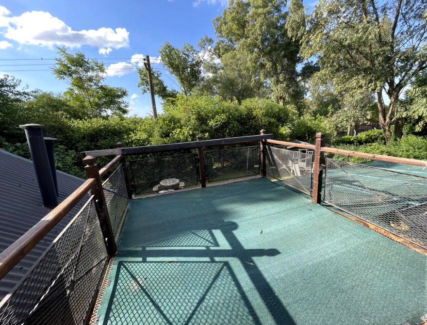 Playroom con balcón terraza y vista a jardín trasero